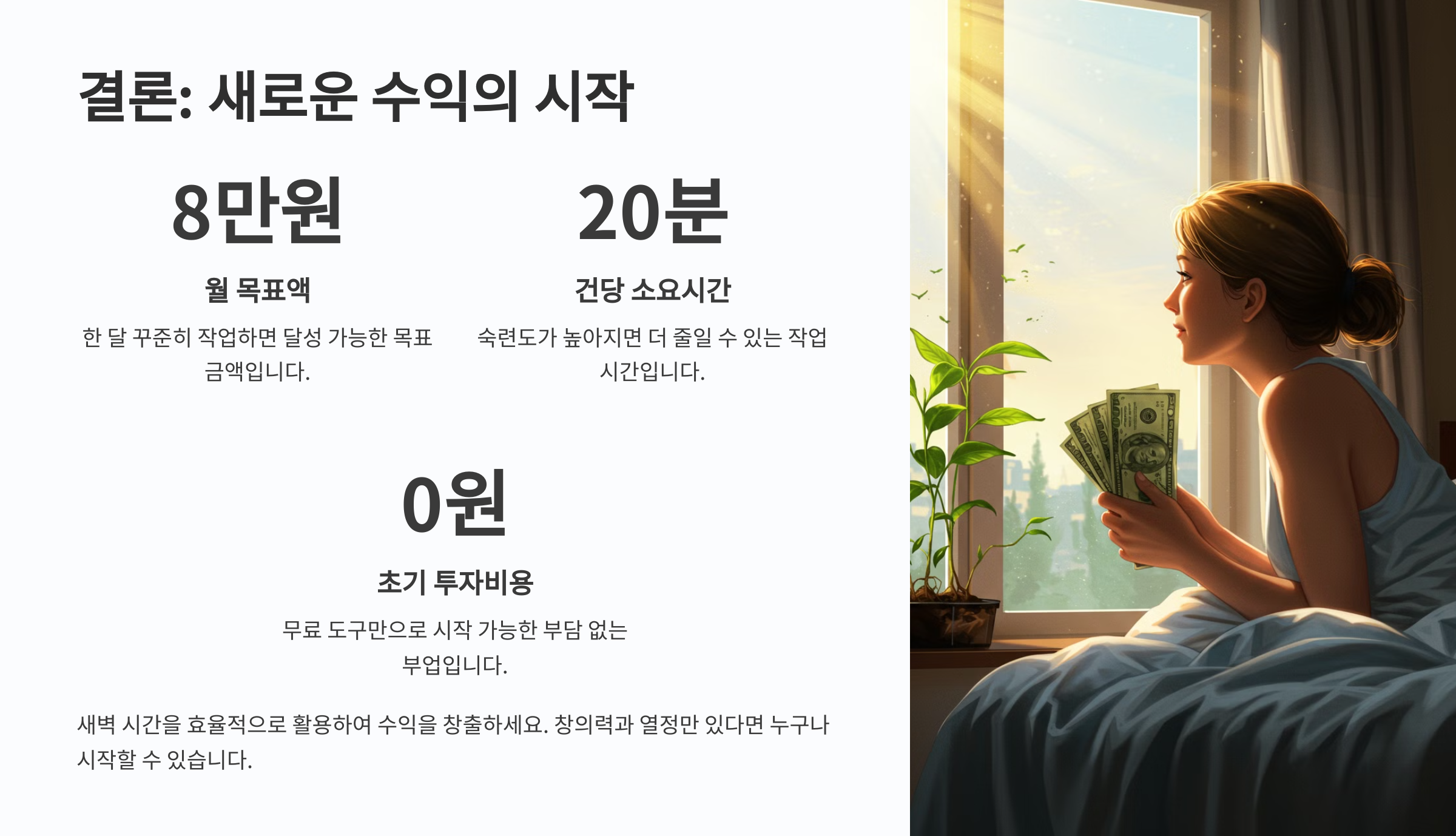 오늘부터 바로 시작해보세요! 처음은 완벽하지 않아도 괜찮습니다. 한 걸음씩 나아가다 보면 어느새 목표 수익을 달성하고 있을 거예요. 여러분의 도전을 응원합니다! 🌙✨