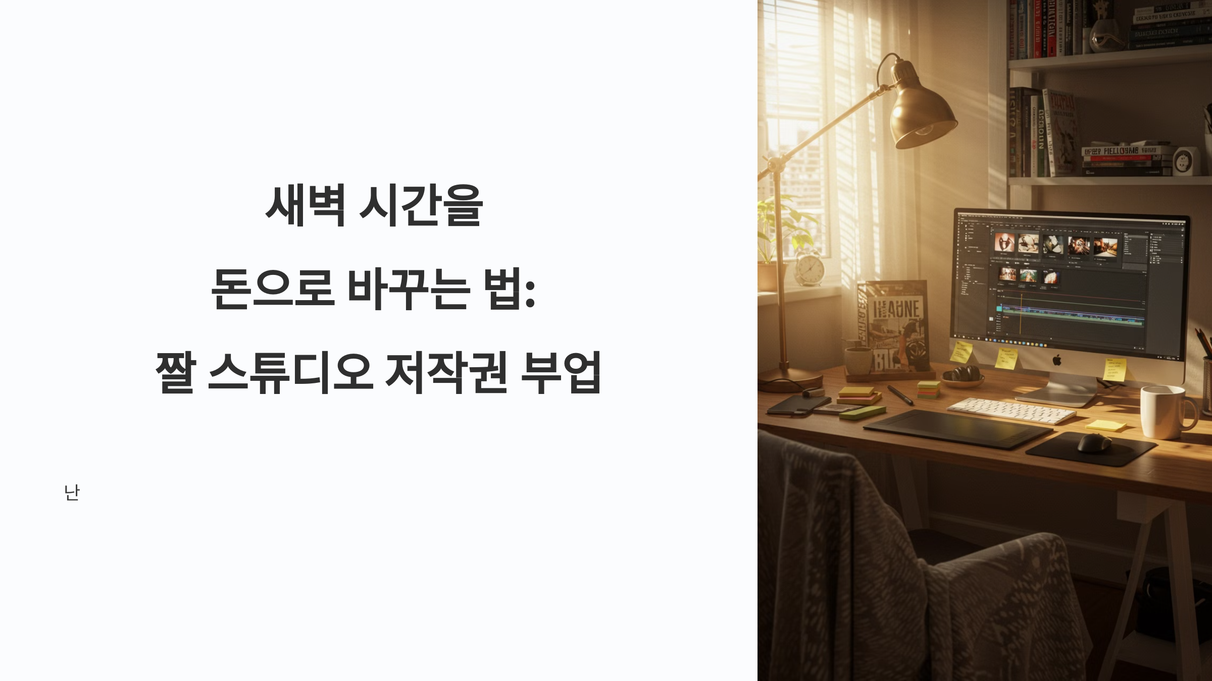 잠 못 드는 새벽 시간을 돈으로 바꿔보세요! 이 글에서는 투자 비용 없이 시작할 수 있는 짤 스튜디오 저작권 부업을 소개합니다. 건당 약 20분 소요, 난이도 4/5지만 한 번만 익히면 쉽게 할 수 있어요. 컨셉 정하기, 대본 작성, 영상 제작, 음원 적용까지 단계별로 알려드립니다. 한 달 꾸준히 하면 목표 금액 8만원 달성 가능! 특별한 심사 없이 바로 시작할 수 있는 이 방법, 지금 바로 알아보세요.