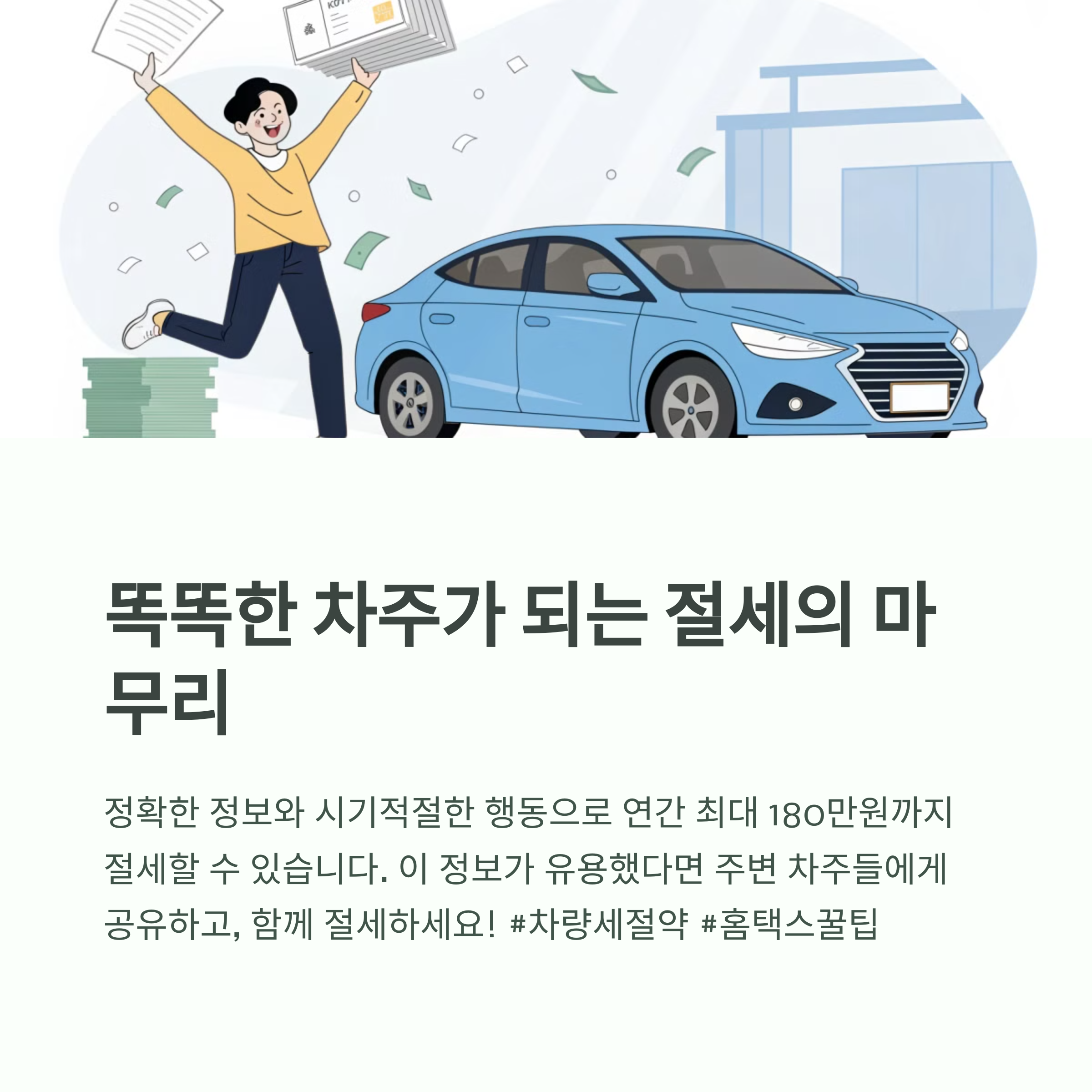 홈택스 차량가액 정보를 활용한 자동차세 절세 방법, 이제 알고 계신가요? 연초부터 체크리스트를 하나씩 실천하면 올해는 최대 180만원까지 세금을 아낄 수 있습니다! 차량을 소유하고 계신 모든 분들께 꼭 필요한 정보입니다! 주변 모두에게 공유하셔서 세금 아끼고 돈 버세요!!