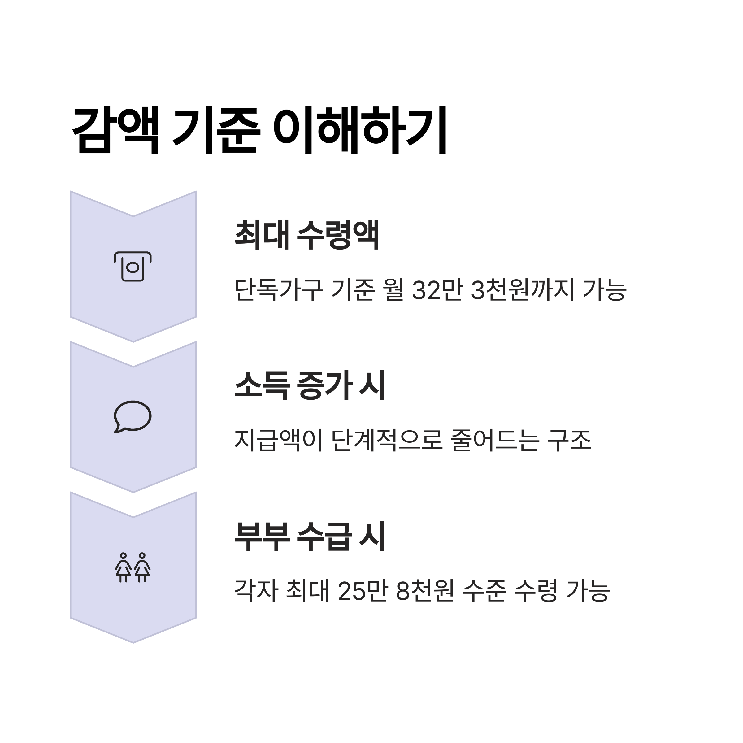 이는 부부 수급 시에도 적용되며, 부부가 함께 받을 경우 각자 최대 25만 8천원 수준입니다.